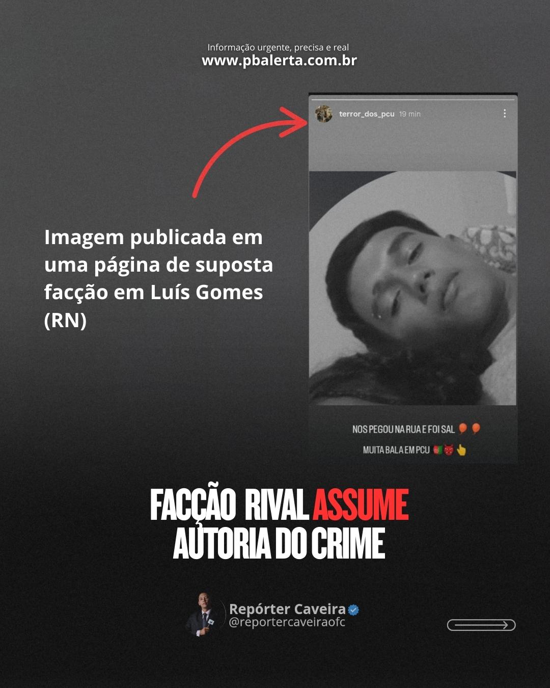 Em uma escalada ainda mais preocupante, uma página de uma suposta facção criminosa publicou nas redes sociais a imagem do adolescente executado, acompanhada da mensagem: “Nós pegou na rua e foi sal, muita bala em PCU”. A publicação levanta fortes indícios de que o crime está diretamente relacionado à disputa entre facções rivais que atuam no município.